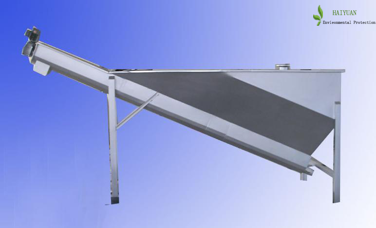 一、概述 螺旋砂水分離器 是沉砂池除砂系統(tǒng)的配套設(shè)備,其作用是將從沉砂池排出的砂水混合液進(jìn)行砂水分離。它是由 1 進(jìn)料沉淀斗、 2 螺旋軸、 3 螺旋槽、 4 支撐架和 5 驅(qū)動(dòng)裝置組成。砂水混合液進(jìn)入進(jìn)料沉淀斗后經(jīng)過斜板沉淀,水從溢流槽排出,螺旋軸將沉砂從水中提升出水面后排放。