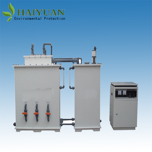 設備組成及工作原理: 1、設備組成 kw系列高效混合消毒劑發生器由電解槽、直流電源、鹽溶解槽及配套管道、閥門、儀表等組成。 2、工作原理 將一定濃度或飽和鹽液加入電解槽陽極室,同時將清水加入電解槽陰極室。接通12v直流電源開始電解,即可產生clo2、cl2、o3、h2o2等混合消毒劑,經水射器負壓管路將氣體吸入水中消毒。 型號規格: